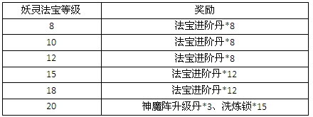 活动期间,将灵戒洞天里任意妖灵法宝等级提升到指定等级,可获得额外系统赠礼。