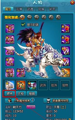 如图,在角色主界面坐骑栏下点击【喂养】即可进入坐骑喂养界面。