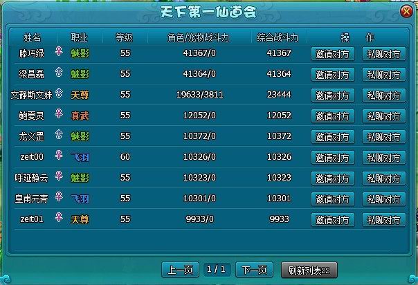 3.点击快速组队,会显示当前本服在线的所有玩家,按照综合战斗力排序,可以邀请列表上的玩家,如下图: