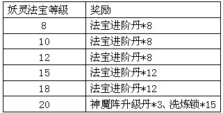 活动期间,将灵戒洞天里任意妖灵法宝等级提升到指定等级,可获得额外系统赠礼。