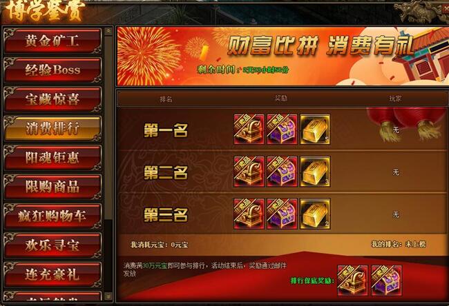 1.活动期间,玩家消费满30万元宝参与排行