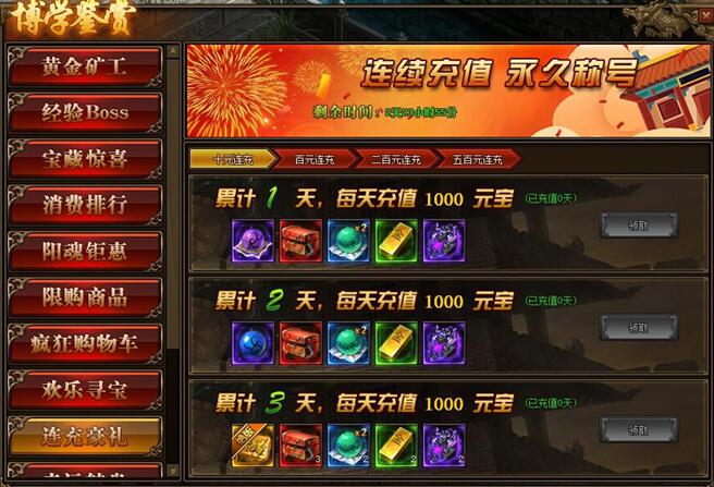 2.累积充值达到三天,奖励翻倍领,更可领取稀有称号(称号可淬炼)!
