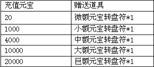 活动期间,玩家充值至指定额度,即可获得对应的元宝转盘符,使用元宝转盘符转动转盘,将可随机获得转盘上任意额度的元宝奖励。每个额度转盘只能转一次,每一轮转完之后将开启下一轮转盘。元宝转盘升级后,最高可累计获得30520非绑定元宝返利哦!