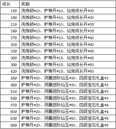 活动规则:活动期间,将仙宠提升至指定成长可获得额外奖励。