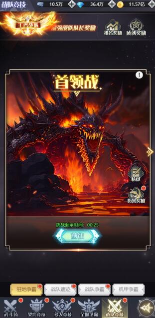 首领战阶段相当于预选赛,此时活动会有一个首领boss,点击便可进入boss场景攻打boss,每次首领战每个玩家可以攻打首领boss三分钟,统计玩家伤害到对应的战队中,根据战队伤害进行排名,前27名的战队才由资格参加下一轮的争夺战