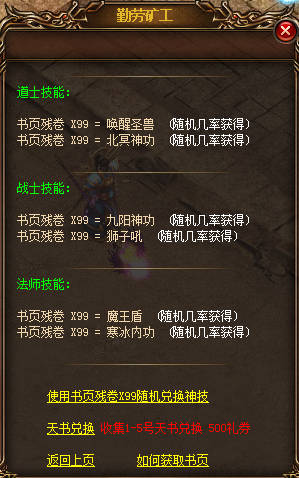 【荒漠土城】安全区【勤劳矿工】NPC可进入尸王殿,击杀尸王殿的BOSS和小怪有一定几率获得书页残卷和无字天书,书页残卷可兑换技能,无字天书可兑换礼券